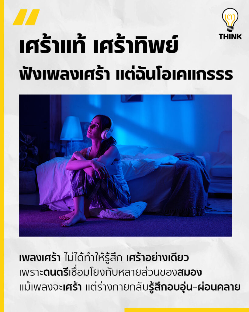 มีคำอธิบายเพิ่มเติมว่า ดนตรีเชื่อมโยงกับหลายส่วนของสมอง ทั้งความทรงจำและระบบประสาทที่ควบคุมอารมณ์ เมื่อเราฟังเพลงที่เรารู้สึกเชื่อมโยง สมองจะปล่อยสารอย่างโดพามีนและออกซิโทซินออกมา ทำให้แม้เพลงจะเศร้า แต่ร่างกายกลับรู้สึกอบอุ่นและผ่อนคลาย
